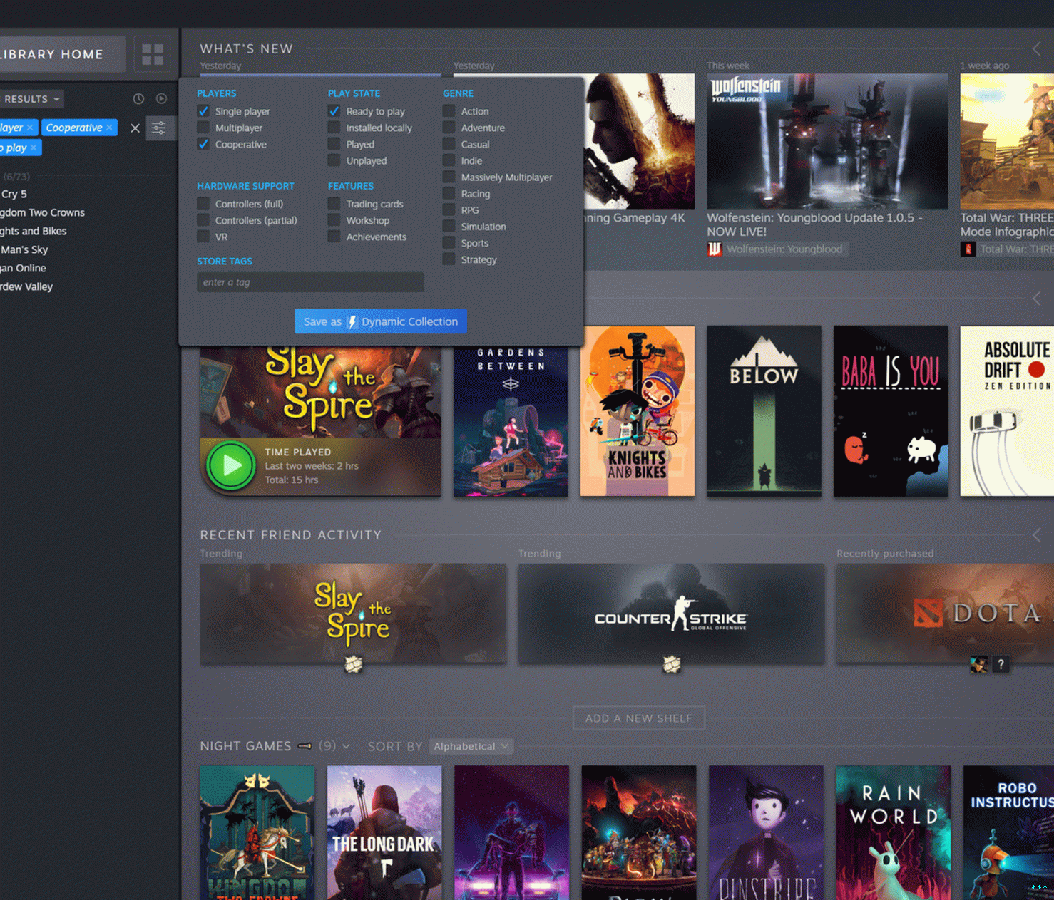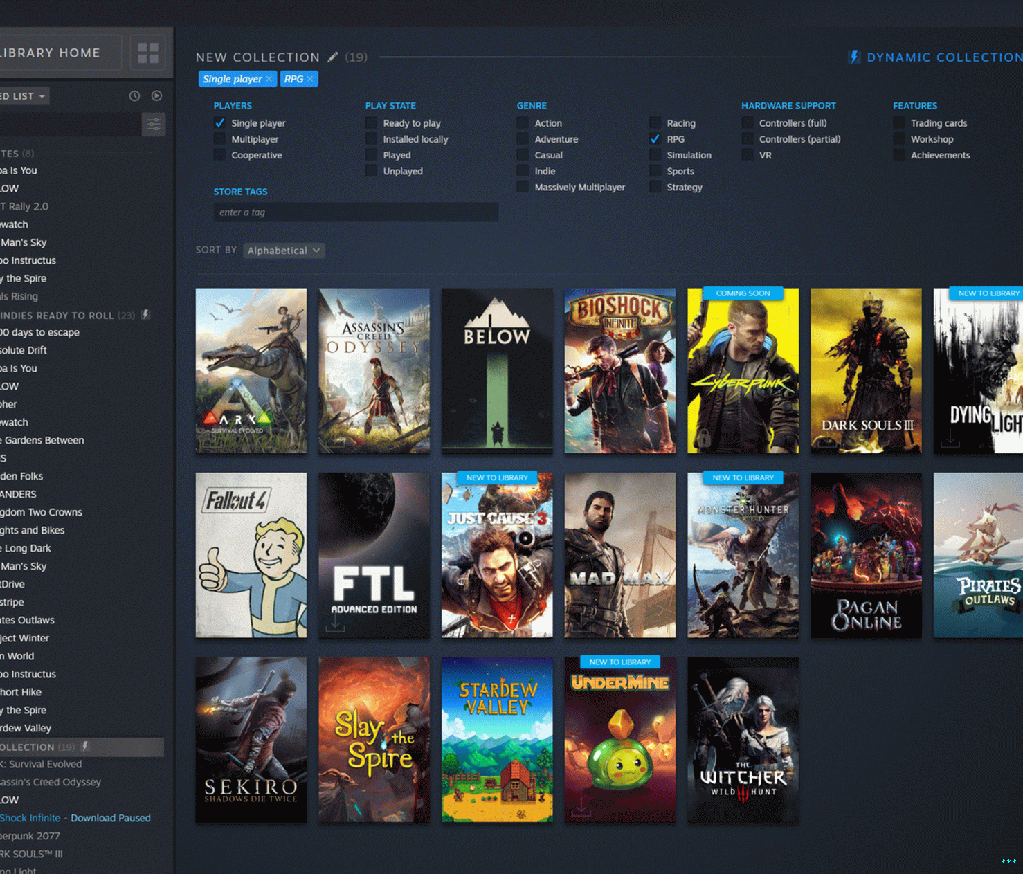 Bunların altında, varsayılan olarak, kendi özel “koleksiyonlarınızdır”. oyunlar. Sürükleyip bırakarak statik bir koleksiyon oluşturulabilir Oyun isimleri kendi toplama kutusuna Bu taklit eder Oyun listenizde “kategoriler” oluşturmak için mevcut, gömülü seçenek. Daha ilgi çekici olan, kullanıcılara izin veren dinamik toplama seçeneği yazın ve istedikleri açıklayıcı etiketi seçin (“tek oyunculu”, “RPG”, “” sıra tabanlı “,” bölünmüş ekran çok oyunculu “, vb.) Steam’in kütüphanenizdeki tüm eşleşen oyunları seçmesi için. Dinamik koleksiyonlar otomatik olarak yeni alımlar ekleyecektir belirlediğiniz kriterlere uyun.