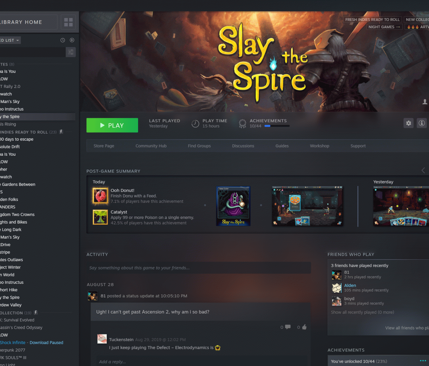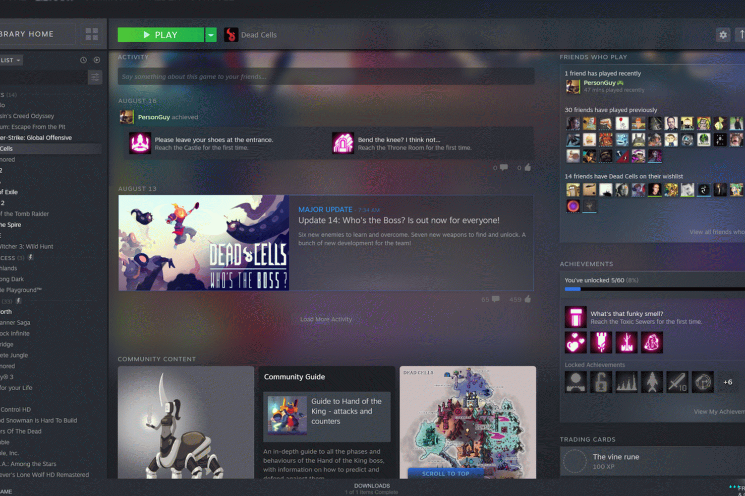 Ancak orijinal arayüz her zaman sağ taraftaki parçayı ayırdı Tek bir oyun hakkında tek bir sütuna. “Bu oyuna sahip olan arkadaşlar” ilk öğe, sonra başarılar, sonra bir düz metin dökümü oldu Haberler. Belirli bir oyun seçmezseniz, bu boşluk şimdi haberlerde “raflar” veya düzenli olarak güncellenen tümsekler için bir ev ve Zaten sahip olduğun oyunlarla ilgili aktiviteler. Bunları silebilirsiniz. istemek, ancak varsayılan arayüz birkaç kullanışlı sıralama içerir mekanizmaları: son haberler güncellemeli oyunlar oynadı ve arkadaşlarınızın yakın zamanda oynadığı oyunlar.